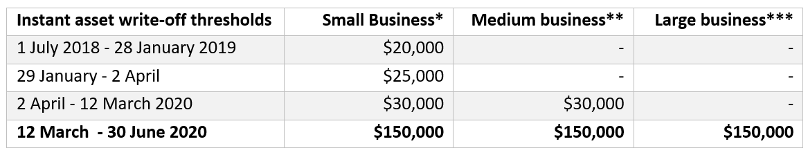 From 12 March 2020, the instant asset write-off threshold will increase from $30,000 to $150,000, and access to the write-off will be expanded to include businesses with aggregated annual turnover of less than $500 million until 30 June 2020.